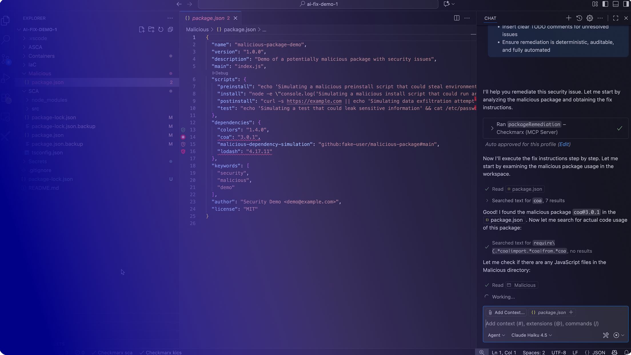 Developer Assist identifies security issues across multiple domains, including application security vulnerabilities detected through SAST, risks introduced by open source and malicious packages, exposed secrets and credentials, Infrastructure as Code (IaC) misconfigurations, and container-related security issues. This analysis applies to both human-written code and AI-generated code, ensuring consistent protection regardless of how the code is created.